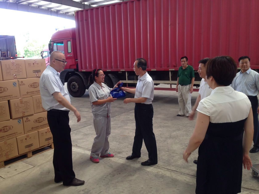 烈日炎炎,熱浪襲人,連續的高溫也牽動著冠生園領導的心。為將公司的關懷和慰問及時傳遞給一線員工,8月16日,股份公司副總裁、冠生園總經理藍雪、副總經理吳堅、黨委副書記邱建生和工會主席楊妍等一行冒著高溫前往冠生園供銷公司奉賢倉庫看望慰問在酷暑中堅守崗位、辛勤勞動的一線職工,并將公司準備的高溫慰問品送到員工手中,讓一線員工們在酷暑感受到了一絲舒心的涼意。